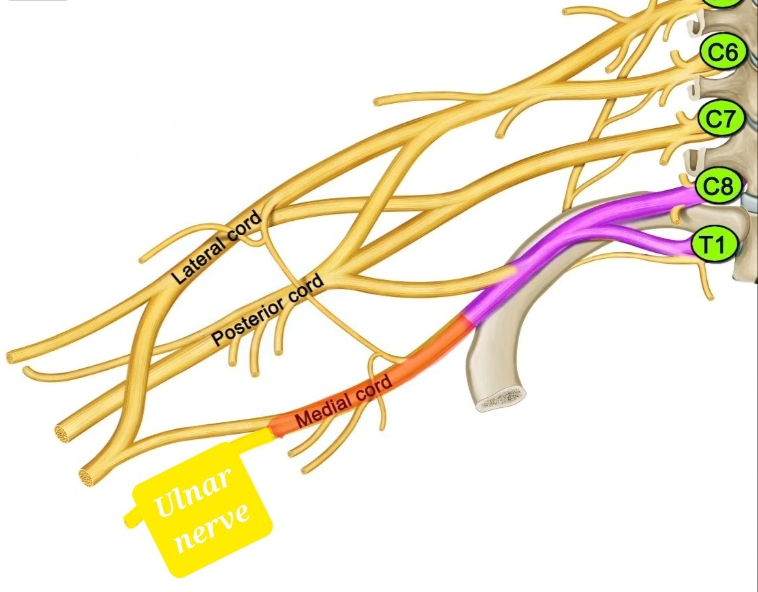 상지의 주요 말초신경 중 하나로 C8~T1(드물게 C7 ) 신경뿌리에서 상완신경총의 내측 척수에서 발생하며,