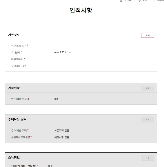 ▶인적사항입력(기본정보, 가족현황, 주택보유 정보, 소득정보, 부채정보)
