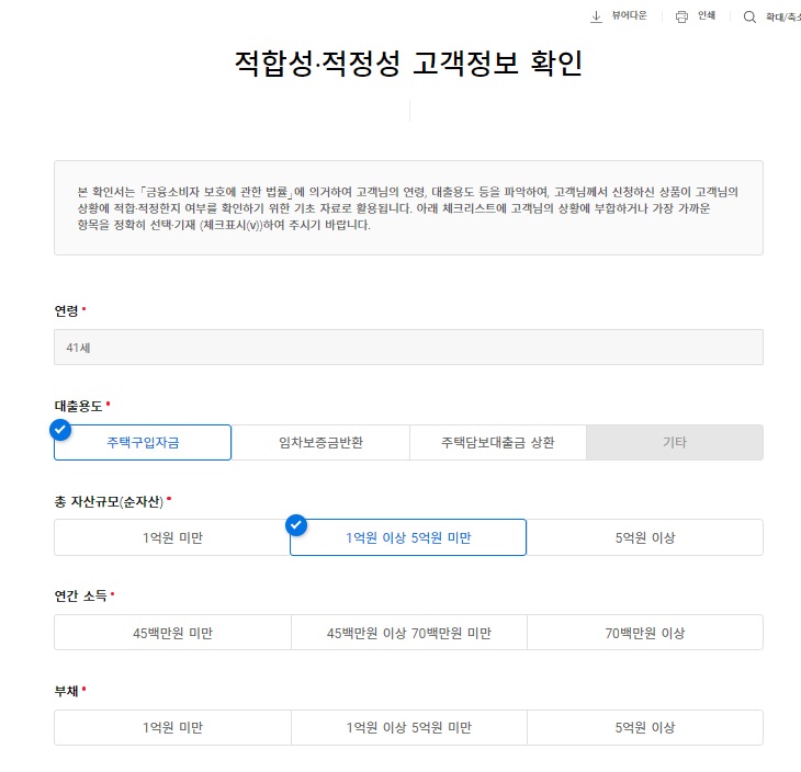 대출용도 - 주택구입자금 체크, 자산규모, 연간소득, 부채, 고정지출 - 연간소득 20% 미만 체크,