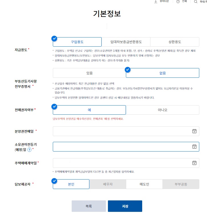 소유권이정등기(예정) 일 - 대략적인 입주예정일, 주택매매계약일, 담보제공자 입력)