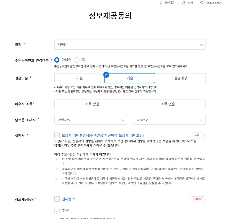 ▶정보제공동의 페의지 작성(담보물 소재지는 아파트 주소) , 보금자리론 설명서 보기해서 읽어보시고 체크,